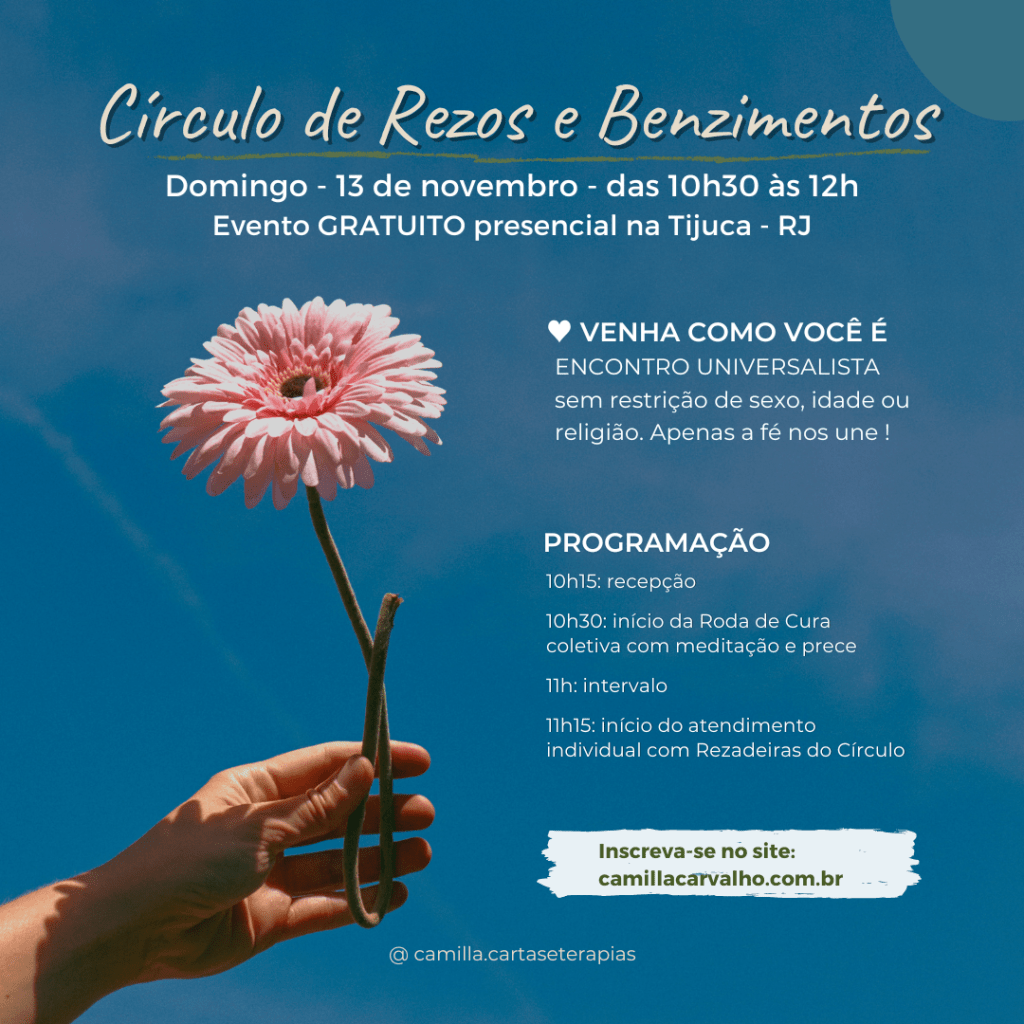 Neste domingo, dia 13, estaremos juntos mais uma vez. Começamos com uma grande roda, onde faremos uma meditação simples, sem nenhuma dificuldade, seguida de leituras sobre fé e amor, sem vínculo religioso. Após, haverá atendimento individual com as rezadeiras do nosso Círculo de Rezos e Benzimentos.