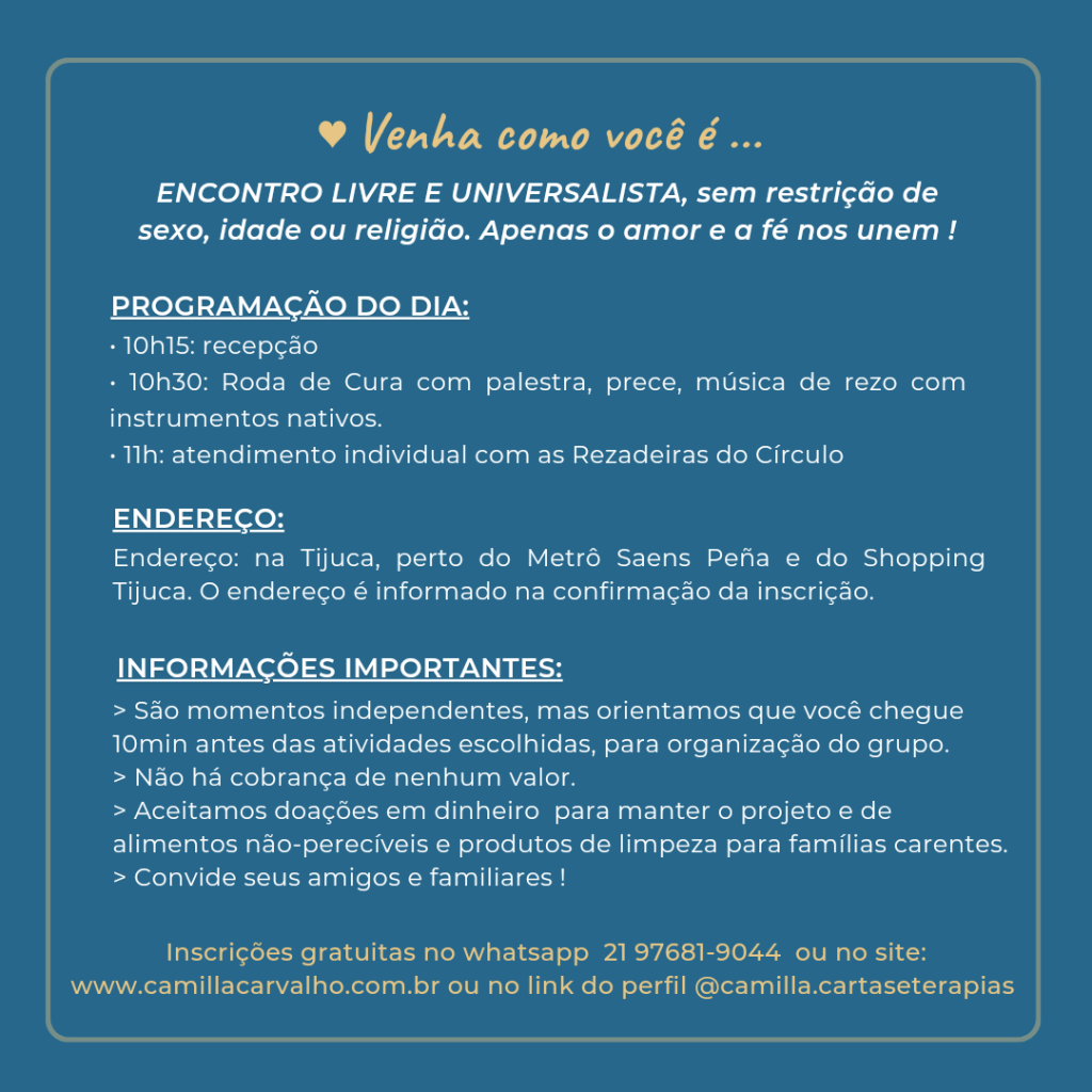 Venha receber seu atendimento presencial GRATUITO com as rezadeiras do Círculo de Rezos e Benzimentos e participar da roda de cura gratuita também. É neste domingo, dia 19/05, das 10h30 às 12h30.