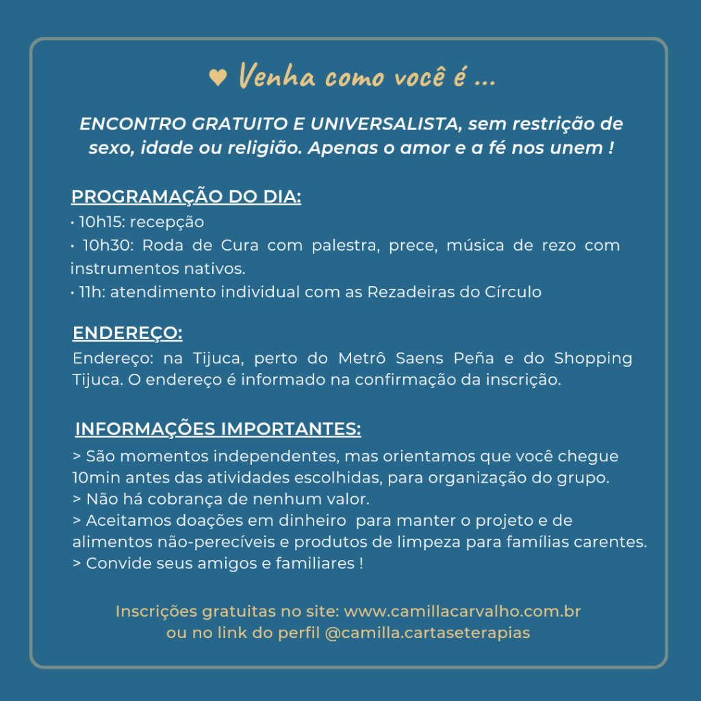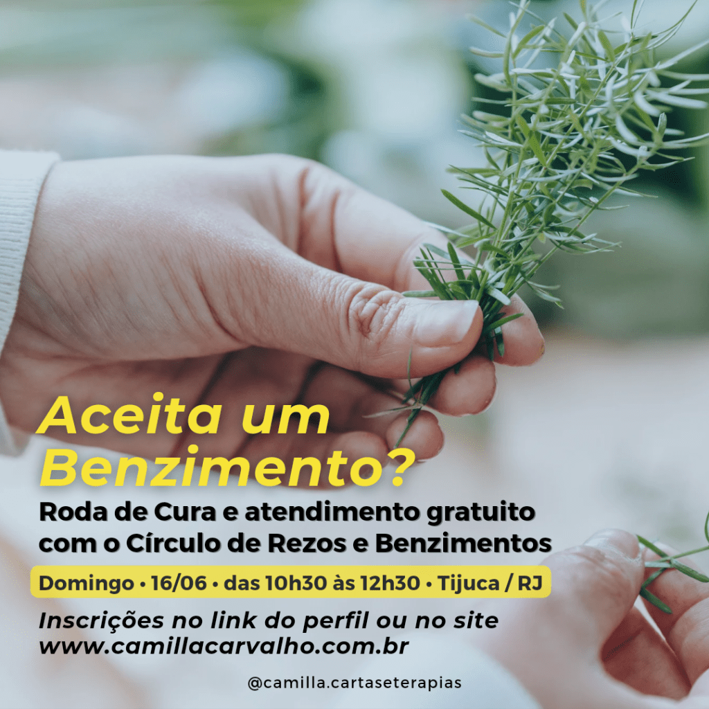 Venha receber seu atendimento presencial GRATUITO com as rezadeiras e participar da roda de cura gratuita também. Neste domingo, dia 16/6, a partir das 10h30, vai ter roda de cura e muito benzimento.