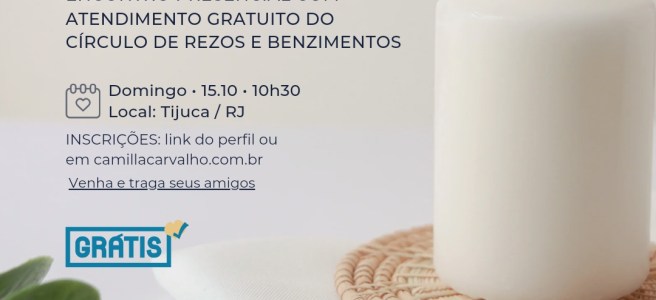 Venha receber seu atendimento presencial GRATUITO com as rezadeiras do Círculo de Rezos e Benzimentos e participar da roda de cura gratuita também. É neste domingo, dia 19/05, das 10h30 às 12h30. ♥ Inscreva-se no whatsapp 21 97681-9044 ou neste link e venha viver esse momento de fé, amor e entrega: https://docs.google.com/forms/d/e/1FAIpQLSfMLGhcrTSdGbtm0vTMzQub5JCxShgO2pUhfuAnuN58OaIyPg/viewform Confira a programação … Continue lendo Roda de benzimento: dia 19/05 na Tijuca