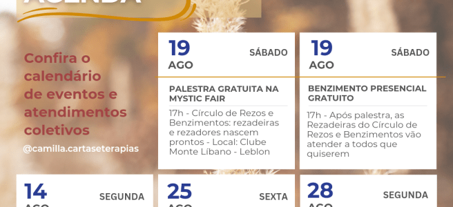 Bora que esse mês tá animado!! Aos poucos vou postar os detalhes de cada um dos eventos e encontros! Coloca na agenda heimmmm Tudo imperdível 😀🙏 Me segue lá no instagram para saber rapidinho de tudo: http://www.instagram.com/camilla.cartaseterapias